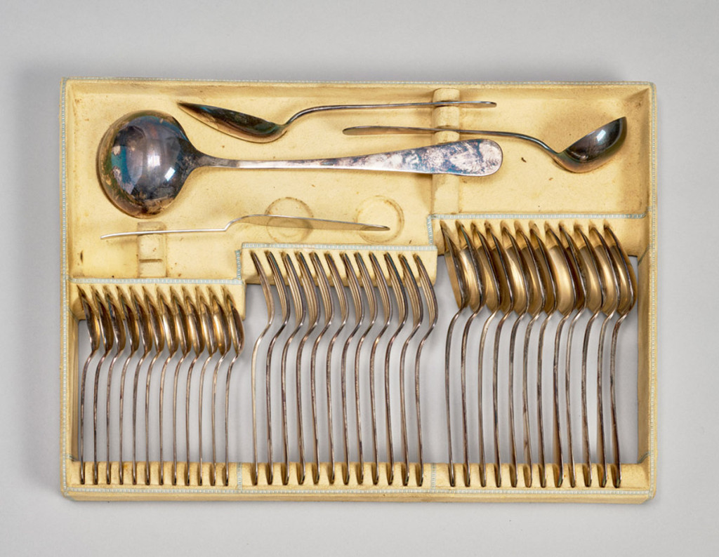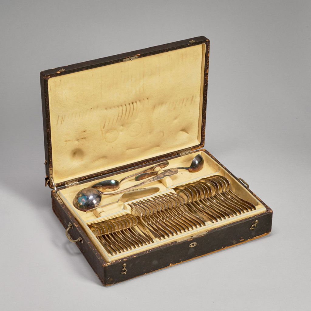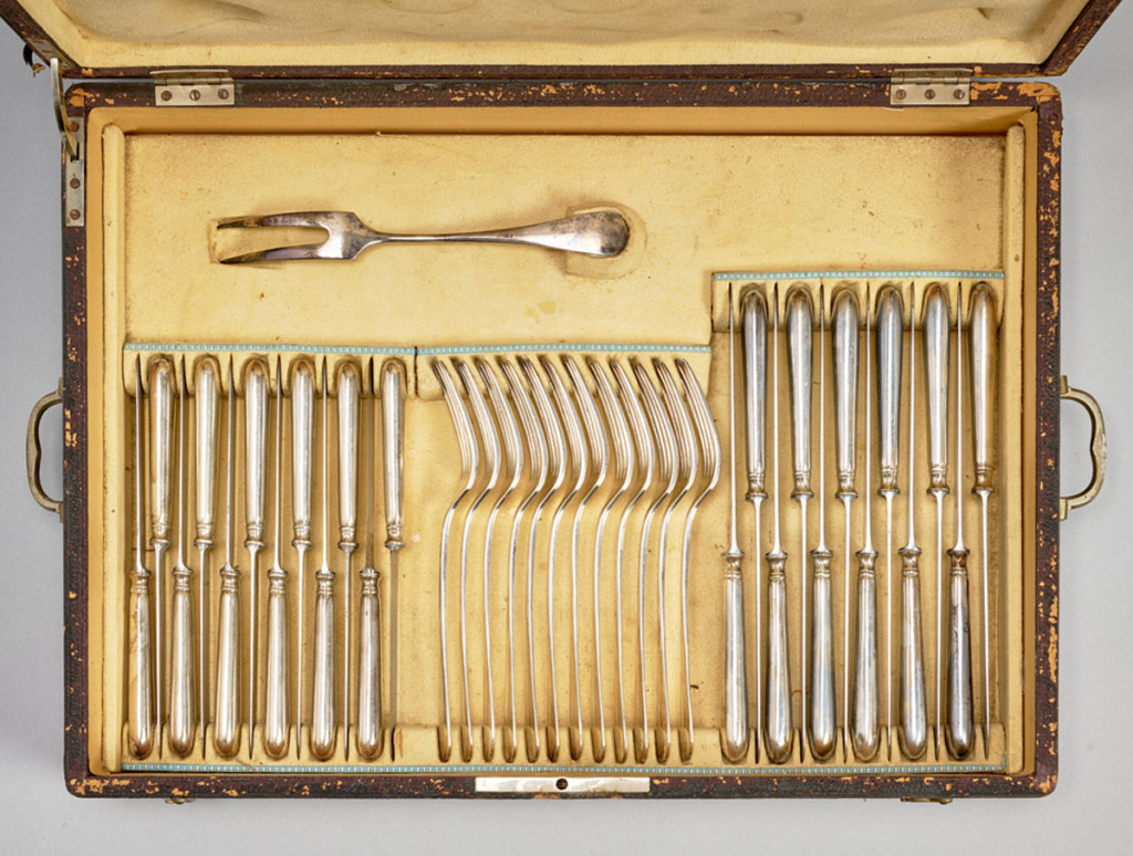 12 személyes 76 darabos evőeszköz készlet, ezüstözött alpakka, német, 1910 körül, dobozban jelzett: WMF, doboza sérült
