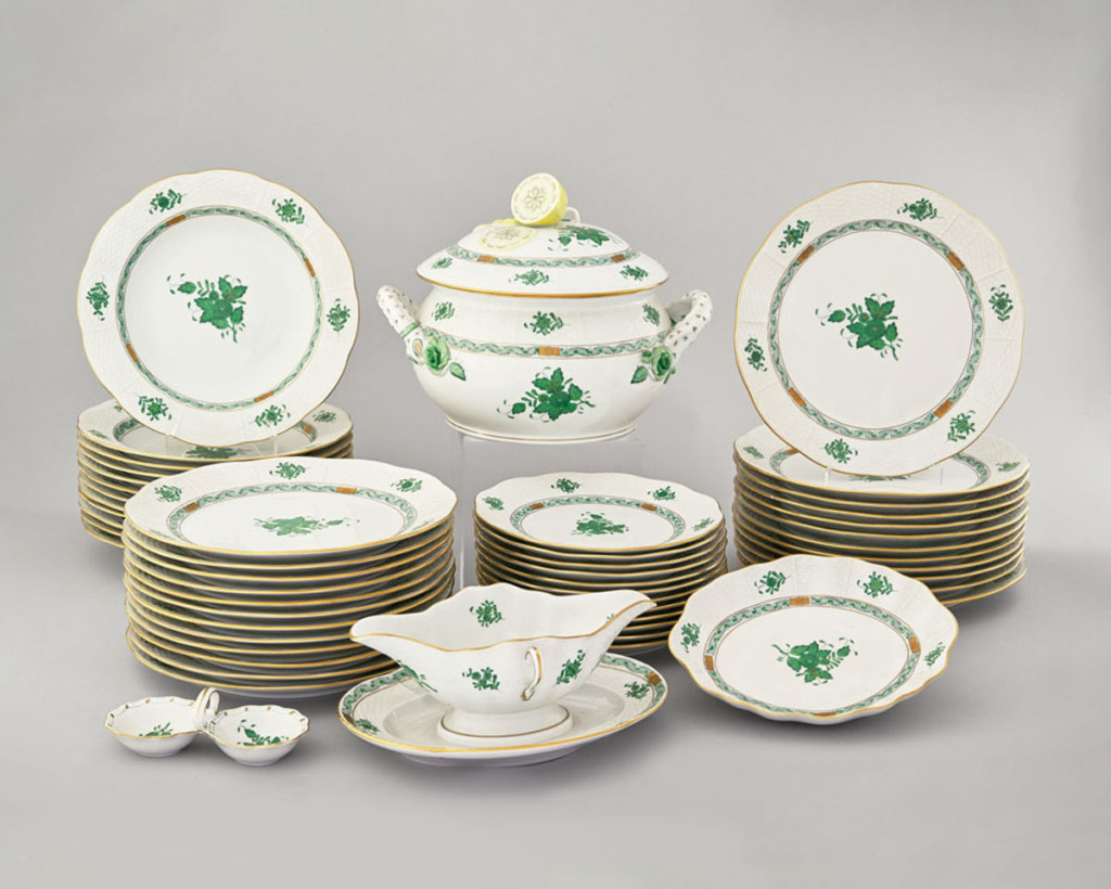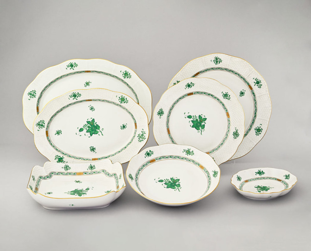 12 személyes 58 darabos étkészlet, festett porcelán zöld Apponyi mintával, Herendi