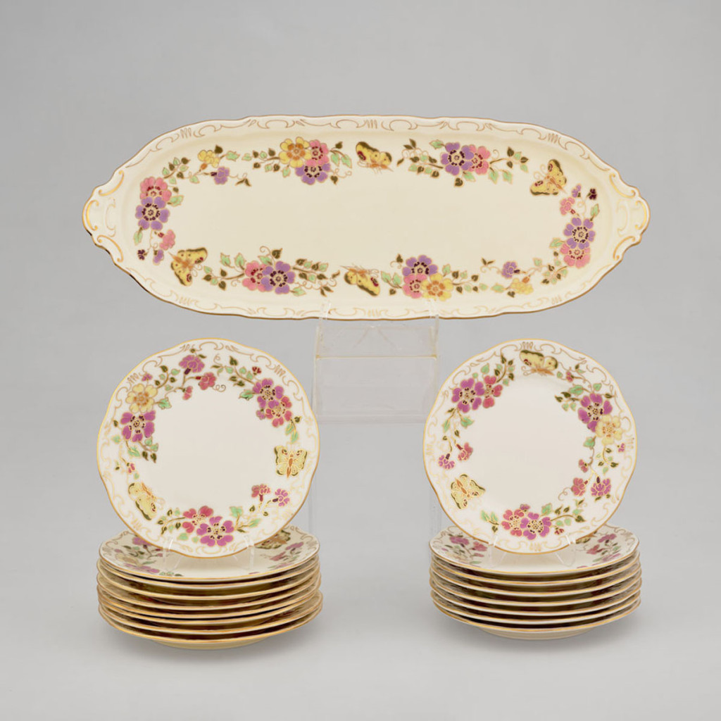 12 személyes szendvicses készlet, festett porcelán pillangós mintával, Zsolnay