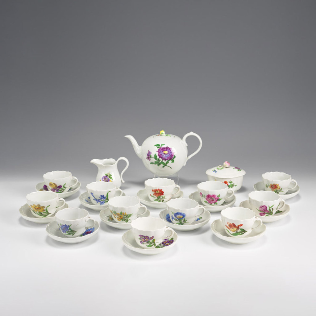 15 darabos teáskészlet, festett porcelán, Meissen, német, alján kardos jelzés, másodosztály, csorbulásokkal