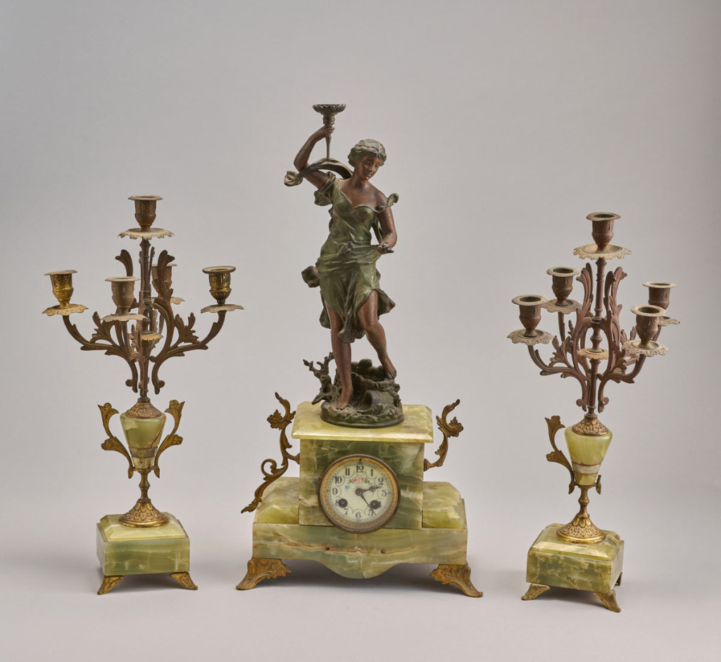XX. század eleje, ónix talapzaton, festett spiater, kopott, sérülésekkel, hiány elemekkel, kulcshiány, óraszerkezet nem működőképes. M: 57 cm óra, 46 cm gyertyatartók