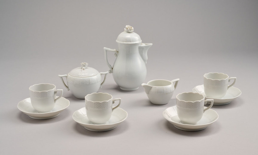 Fehér töredék porcelán, 4 db csésze aljjal, M: 9 cm cukortartó, 17 cm kanna, 5,5 cm kiöntő, 6 cm csésze, 11,5 cm átm. csészealj