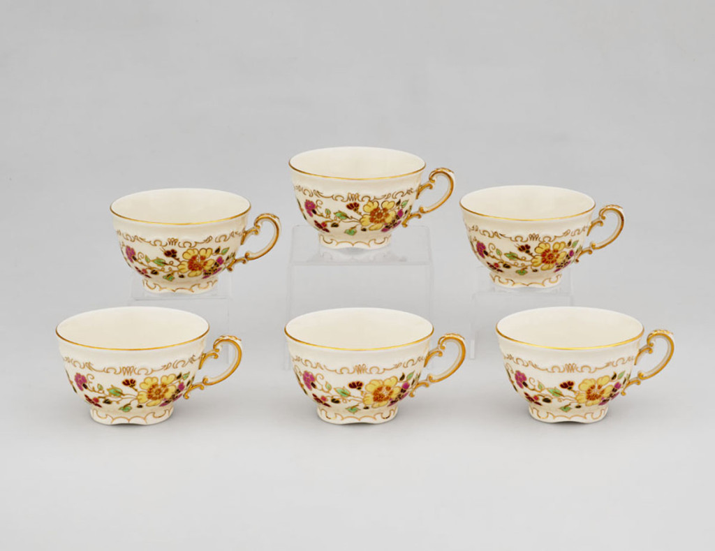 6 darab teáscsésze, festett porcelán pillangós mintával, Zsolnay, alj hiányzik