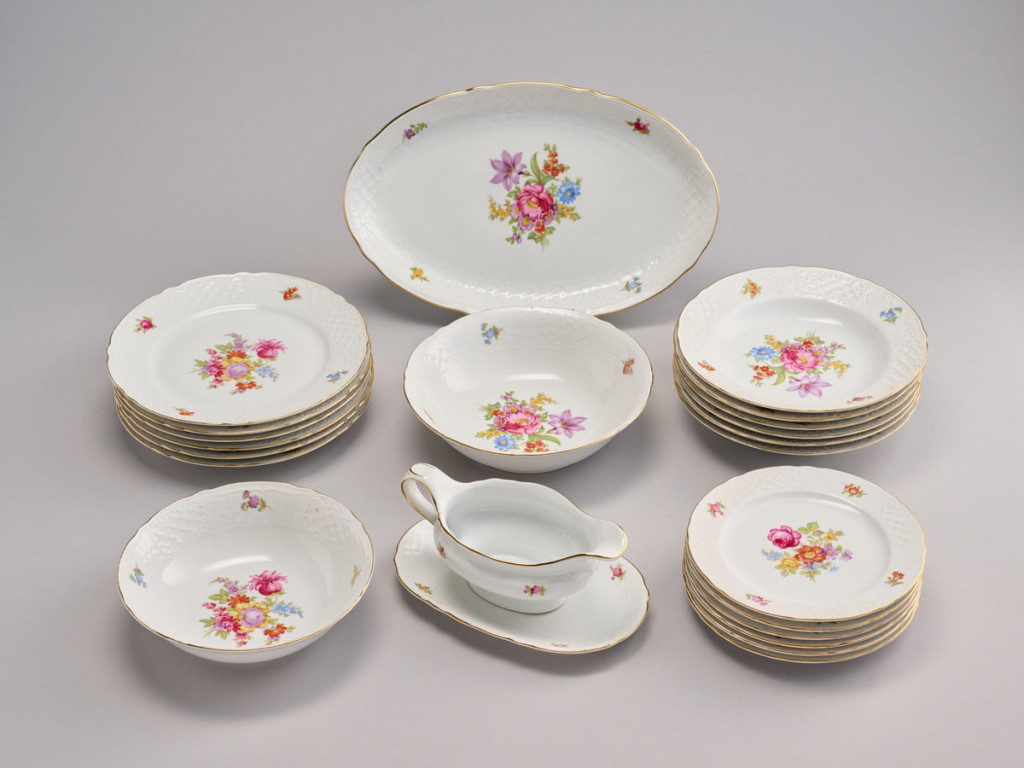 6 személyes 23 darabos étkészlet, festett porcelán, kopott, hibás