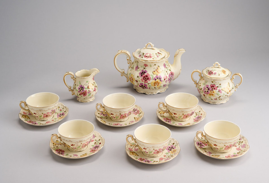 6 személyes 9 darabos teáskészlet, festett porcelánfajansz, Zsolnay, pillangómintás