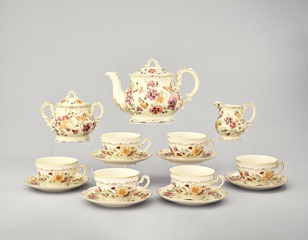 6 személyes porcelán teáskészlet, festett porcelán pillangós motívummal, Zsolnay
