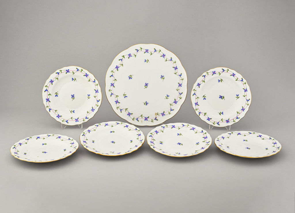 6 személyes 7 darabos süteményes készlet, festett porcelán Blue garden dekorral, Herend, átm. 19 cm és 27 cm