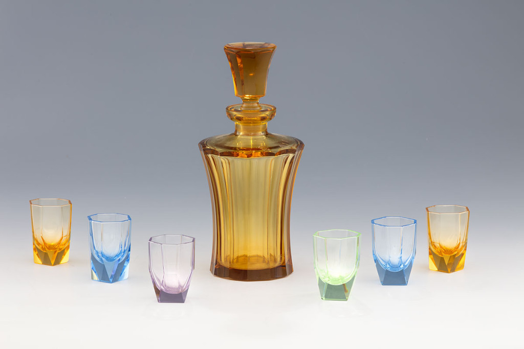 1 db palack, 6 db pohárka, csiszolt üveg, cseh, XX. század, M: 21,5 cm (palack), 5,5 cm (pohárka)