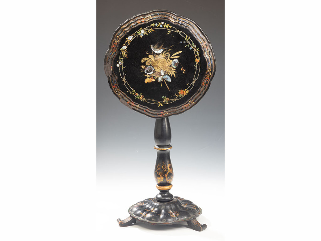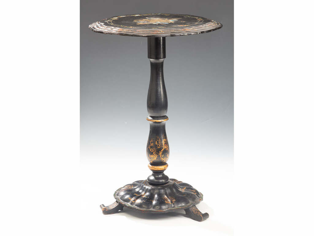 Feketére pácolt és lakkozott, esztergált fa alapra papírmasé technikával készült kör alakú asztal. Felületén dúsan aranyfestett motívumokkal, tetején gyöngyház berakással. Kisebb sérülésekkel. Angol, XIX. század második fele. M: 75 cm, átm.: 52 cm