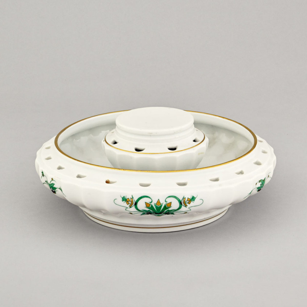 Színesen festett és aranyozott porcelán. Alján jelzett: zölddel bélyegzett Meissen gyári jel, valamint máz alatt kékkel bélyegzett Made in Hungary. Német, 1920-as évek, Stockhardt & Schmidt-Eckert. M.: 9 cm, átm.: 23 cm