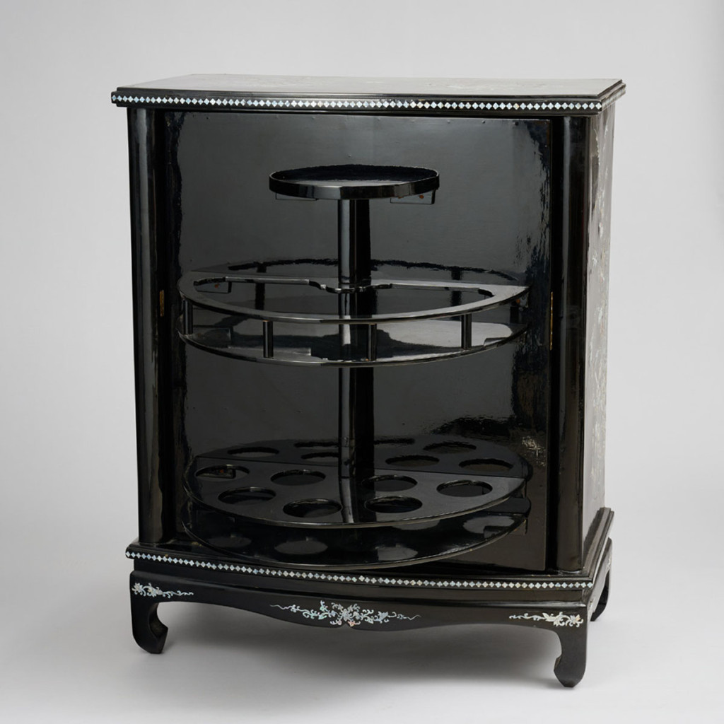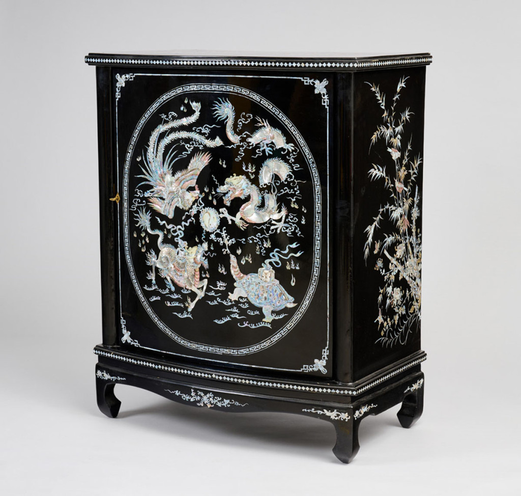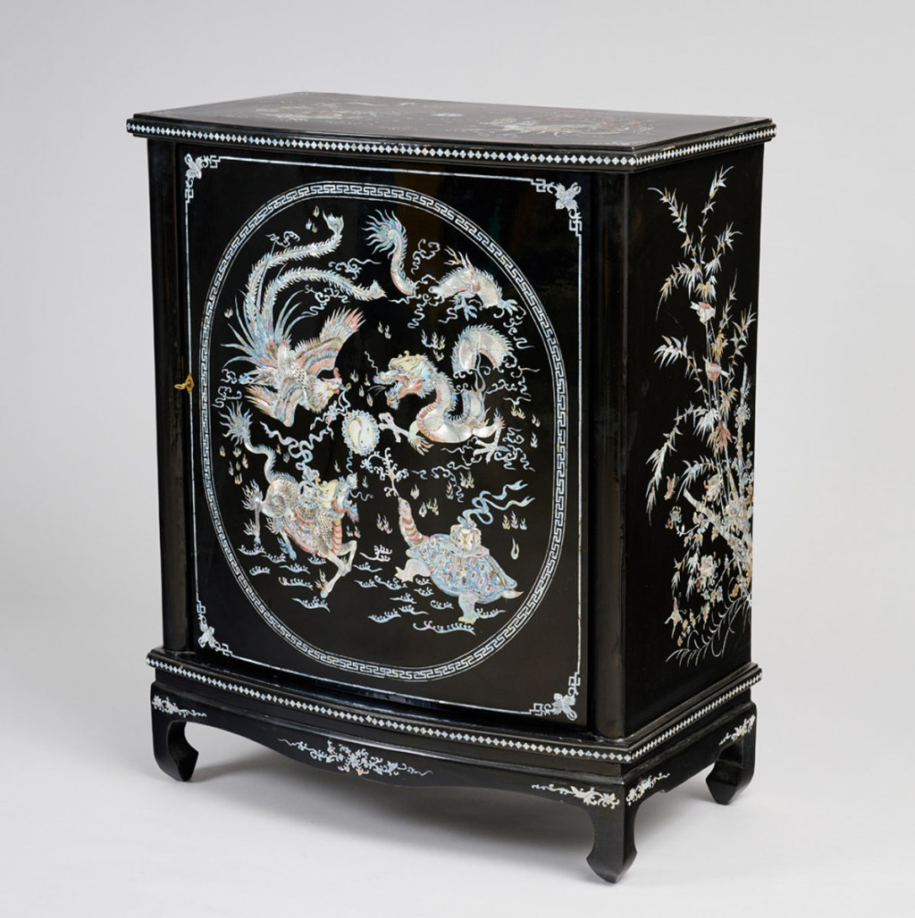 faragott lakkfestett fa berakással, M: 90 x 52 x 110 cm