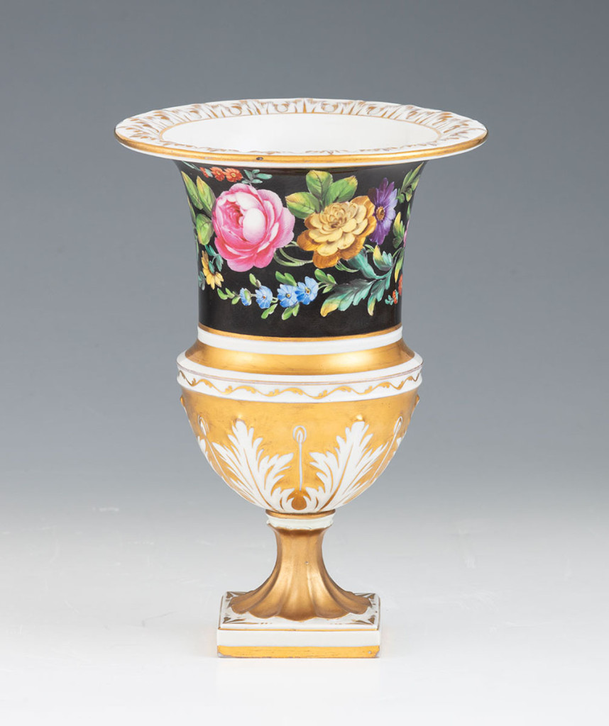 Színesen festett és dúsan aranyozott porcelán. Szögletes talpon pasztózus arannyal festett, reliefszerűen kidomborodó akantuszlevelekkel díszített szár és szájperem. Palástján fekete fondon, aprólékosan megfestett biedermeier virágcsokrok. Szára restaurált. Alján jelzett: máz alatt kobalttal festett bécsi jelzéssel. Cseh, 1870 körül. M.: 21 cm