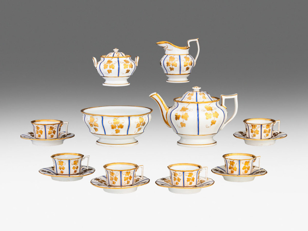 Porcelán. Teáskanna, tejkiöntő, tejszínhabos tál, cukortartó és hat darab teáscsésze aljával. Felületén aranyozott szőlőleveles dekorral és kék vonaldísszel. Csészék peremén apró csorbákkal. Aljukon jelzett: masszába nyomott gyári jel és 841-848. Bécs, 1840-es évek. Kanna m.: 17,5 cm, tejkiöntő m.: 13 cm, cukortartó m.: 10,5 cm, csésze m.: 5,5 cm, alj átm.: 16 cm, tálka m.: 9,5 cm, tál átm.: 20,3 cm