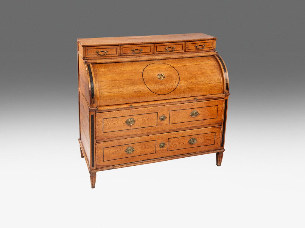 Fenyő alapon dió- és tölgyborítással, kihúzható írólappal, fiókokkal. XVIII. század vége. M.: 120 × 115 × 65 cm