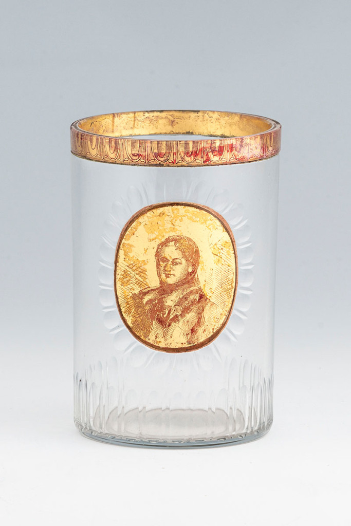 Fúvott üveg, karcolt aranyfólia díszítéssel. Előlapján köszörült, ovális medalionban női portré. Belső rétege repedt. Johann Joseph Mildner után Josef Pohl, Haida, XX. század eleje. M.: 12 cm
