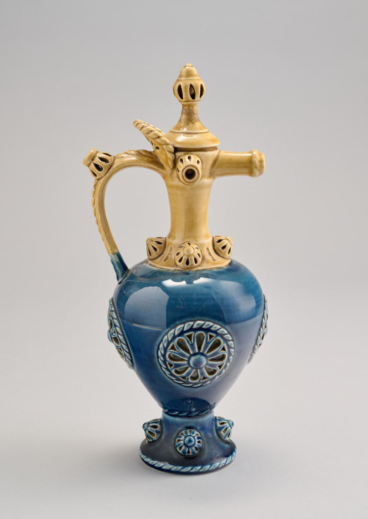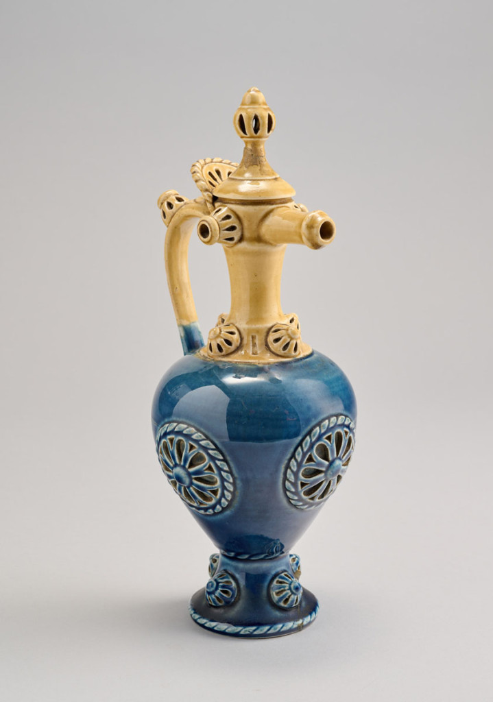 Füles díszkorsó, majolika, fedele javított, áttört díszítésekkel, Zsolnay, XIX. század vége, alján jelzett mélynyomással: Zsolnay, Pécs, formaszám: 2034, M: 29 cm