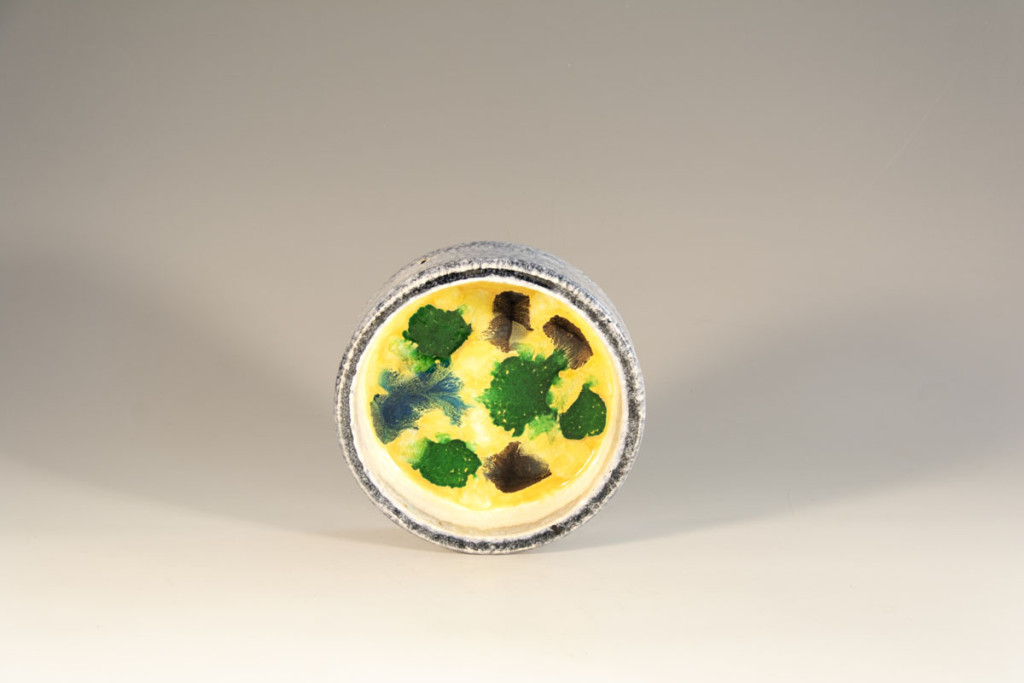 Samottos kerámia, színes üvegmázakkal festve. Hátoldalán festett Gádor jelzéssel. 1962-72 között. Átm.: 21,5 cm