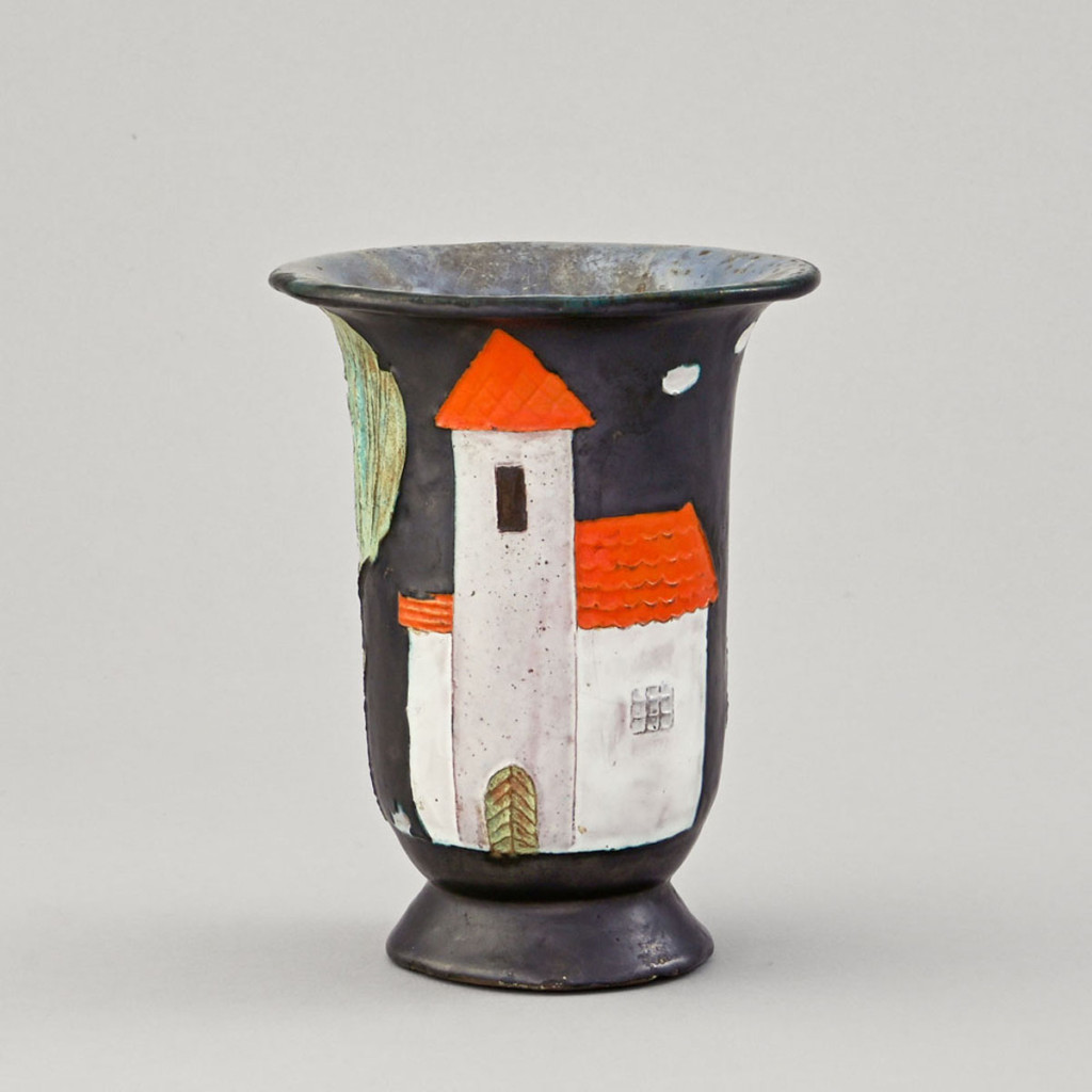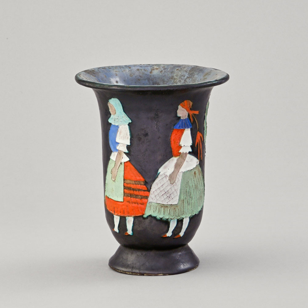 Fekete mázas alapon színes mázakkal festett kerámia. Alján jelzett: masszába karcolt Gádor. 1930 körül. M.: 17 cm