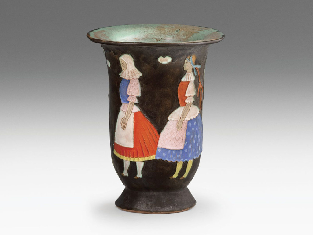 Fekete mázas alapon színes mázakkal festett kerámia. Alján jelzett: masszába karcolt Gádor. 1930 körül. M.: 17 cm