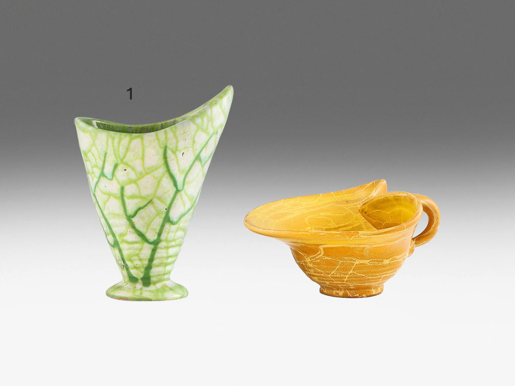 Korongozott és kézzel formált vörös cserép. Oldalukon sárga, ill. zöld repesztett (ún. Bidtel) mázas alapon színes lefolyó (coulé) mázakkal festve. Aljukon jelzett: G NV háromszöggel Gorka. 1935 és 1950 között. M.: 19 cm