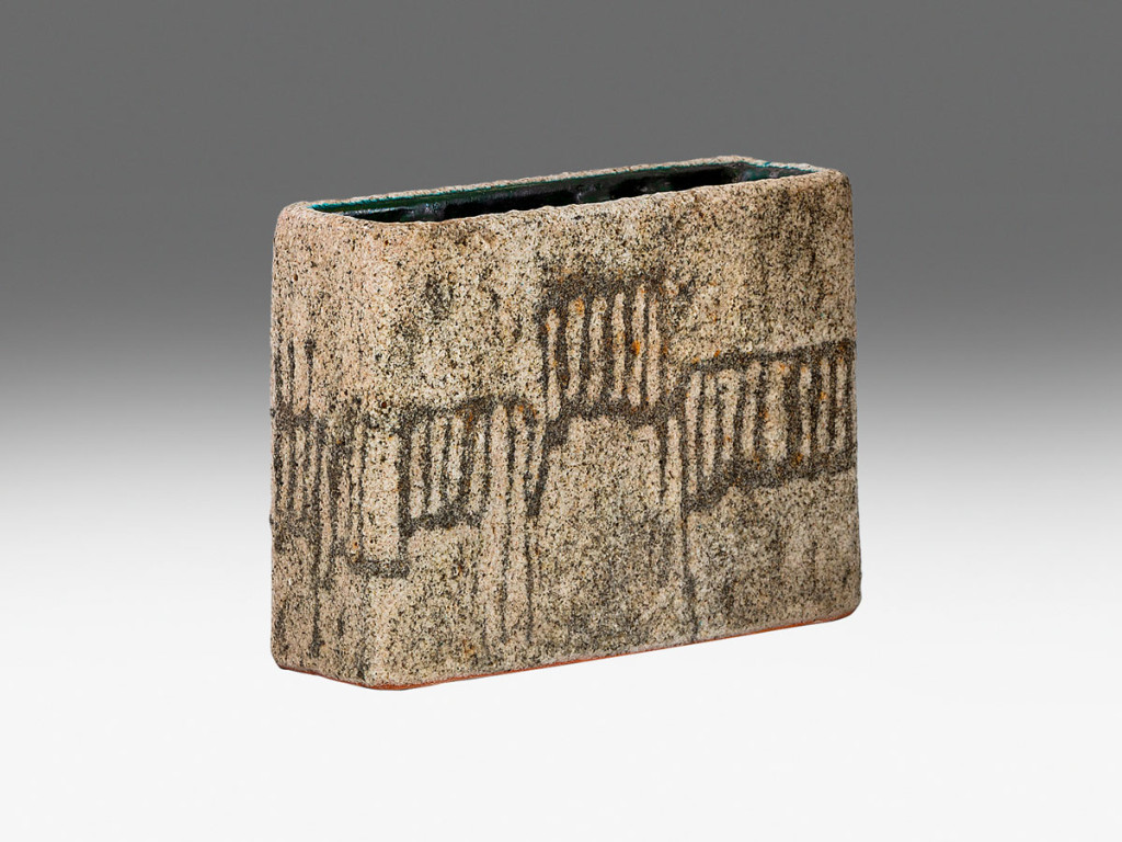 Lapokból épített, kézzel formált, szürke-fehér mázas, samottos kerámia. Belsejében négy részre osztva és zöld mázzal borítva. Alján jelzett: mázzal festett művészjelzéssel. M.: 22 × 6,7 × 16,8 cm
