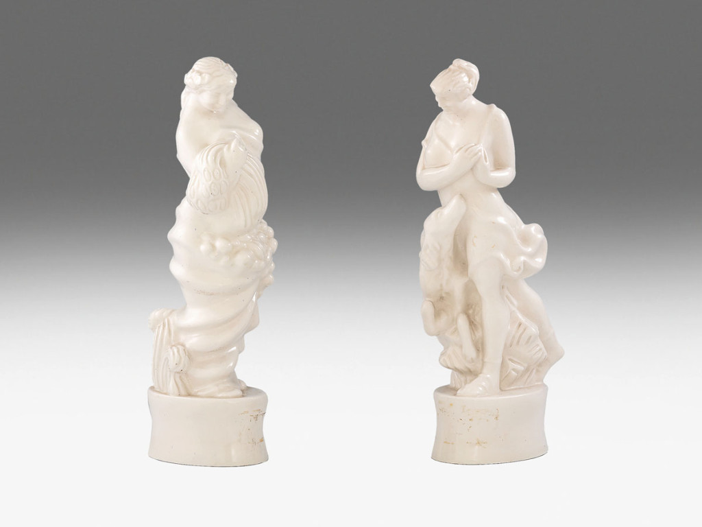 Ceres és Diana istennők jugendstil stílusú szobrai. Belsejükben applikált kerámialapon jelzettek: Ceresen masszába nyomva 238 (formaszám) és 1, 2 valamint Helena Johnová, ill. Dianán masszába nyomott 234 (formaszám) és 22, 2, valamint Helena Johnová. Cseh, 1913. M.: 25 cm