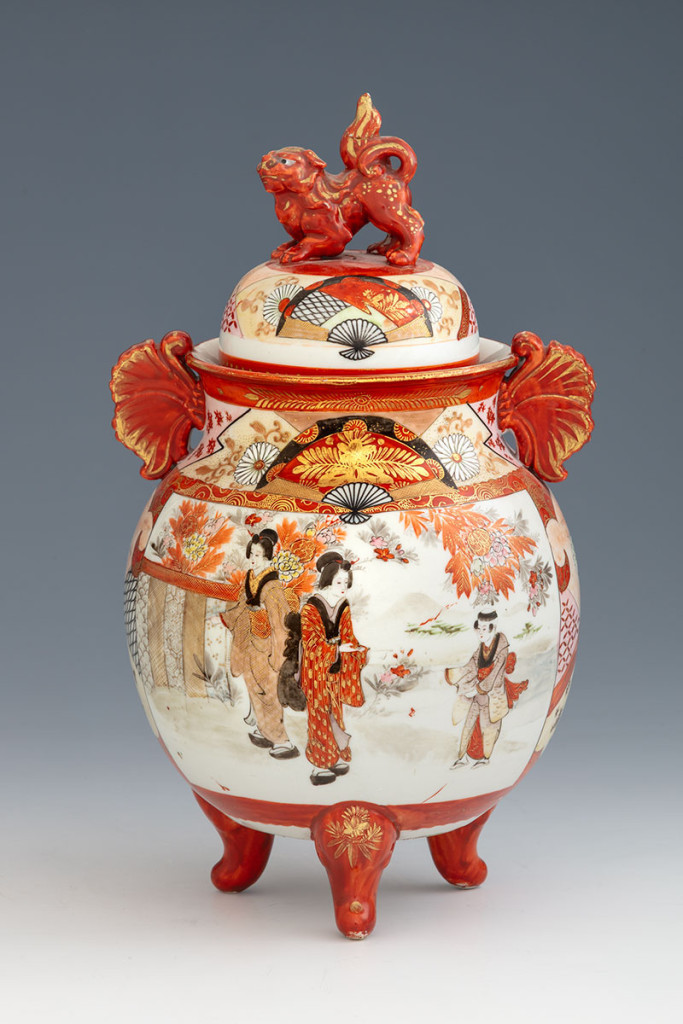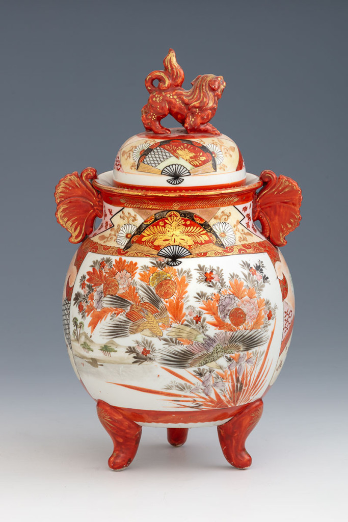 Porcelán, színesen festett, oldalán gésák és madarak ábrázolása, leemelhető fedelén plasztikus fókutya (sérült), Japán, XX. század első fele, alján pirossal festett készítői jelzéssel (kandzsikkal), M: 32 cm