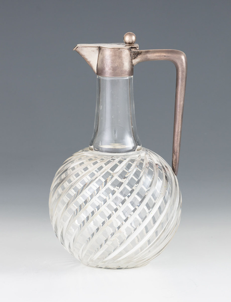 Fúvott és csiszolt, optikailag díszített, színtelen üveg ezüst montírozással. Zsanéros fedelén vésett tulajdonosi monogram. Jelzett: Heilbronn, 1900 körül, Bruckmann & Söhne, 800-as fémfinomsági-, valamint 1902 utáni prágai behozatali jellel. Német, 1900 körül. M.: 19,5 cm