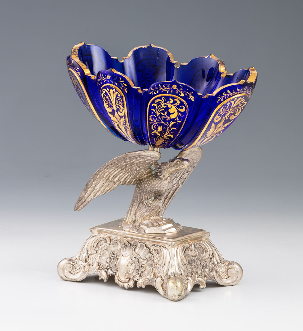 Ezüstözött fém, kék alapon aranyozott díszítésű üvegedénnyel. Négyzetes talapzaton kitárt szárnyú sas figurával. Aranyozás kopott, peremén néhol csorba, üvege törött. M.: 20 × 19,5 cm