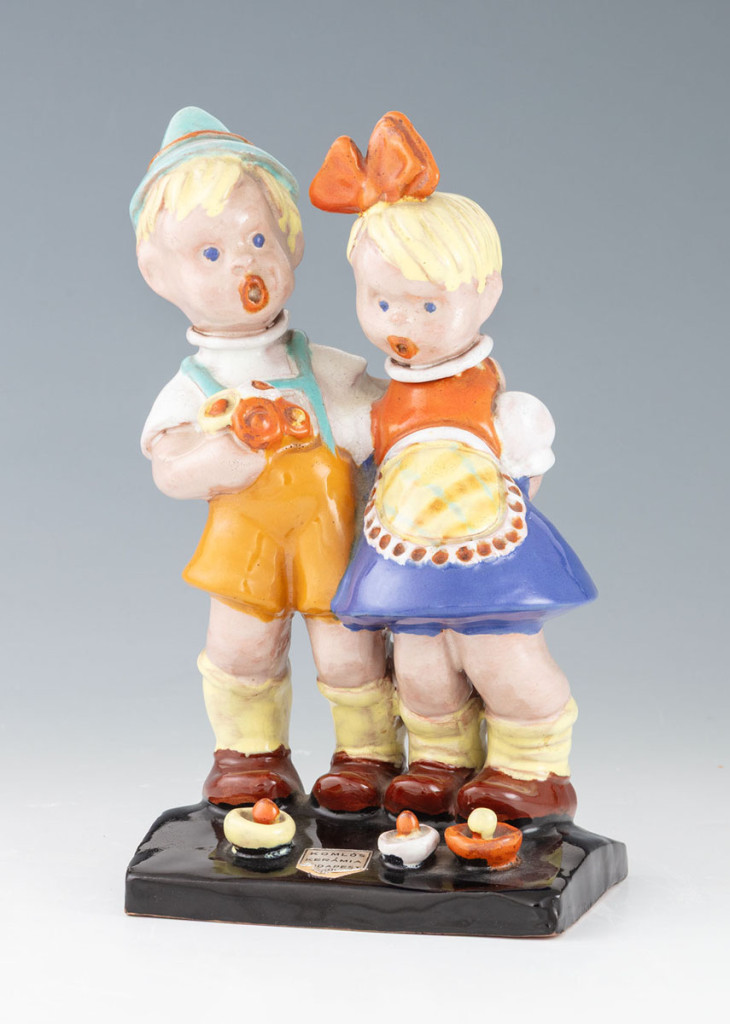 Színes mázakkal fedett kerámia. Jelzett: masszába nyomott Komlós és Made In Hungary bélyegzővel, valamint talapzatán felül ezüstszínű címkével. Komlós Testvérek, Budapest, 1940 körül. M.: 13 × 9 × 21,5 cm