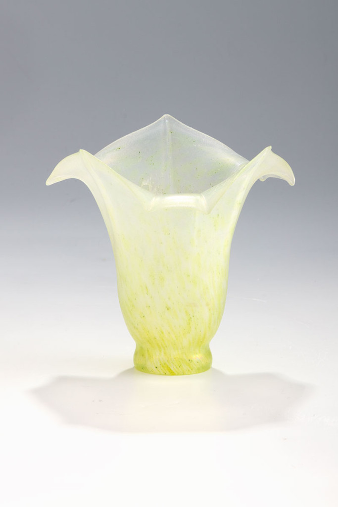 Fújt, anyagában színezett, savmaratott, irizáló üveg lámpabúra. Horváth Márton, XX. század vége. M.: 12 cm