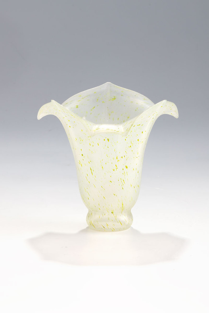 Fújt, anyagában színezett, savmaratott, irizáló üveg lámpabúra. Horváth Márton, XX. század vége. M.: 12 cm