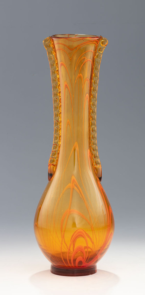 Borostyánszínű üveg, szál díszítésű, XX. század, Murano, alján csorbult, M: 40 cm