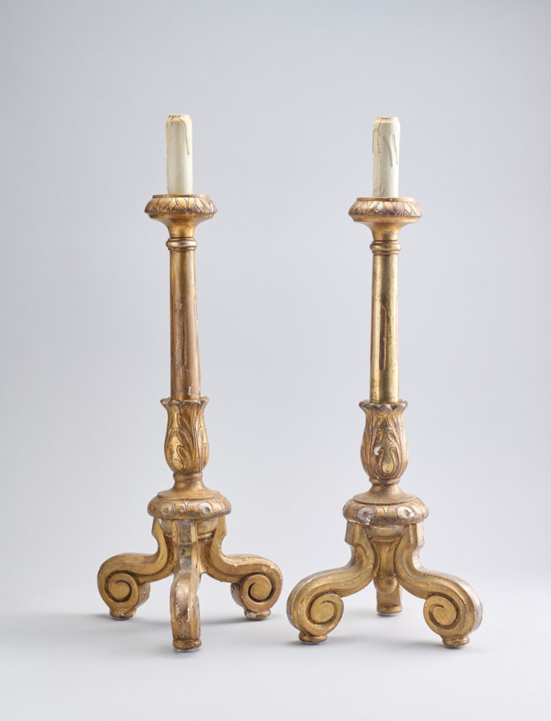 Nagyméretű templomi gyertyatartópár, alakított, faragott fa, aranyozása kopott, M: 66 cm