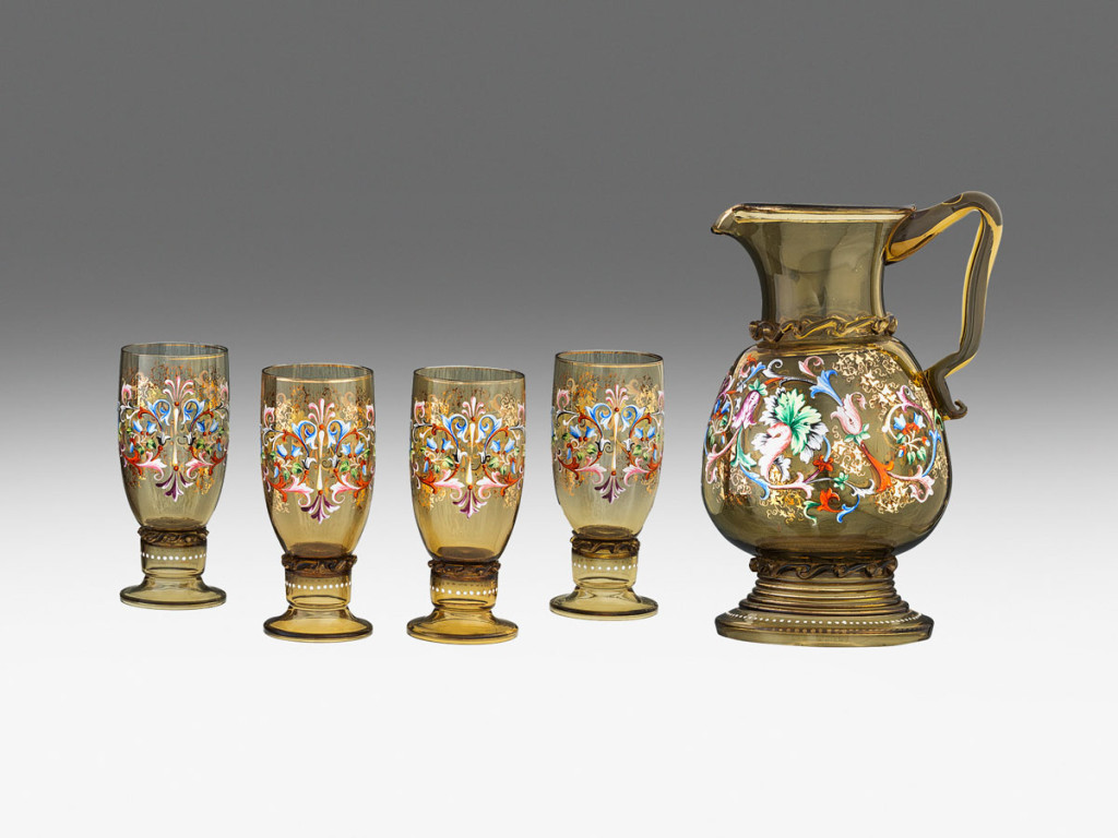 Kiöntő, négy darab pohárral. Fúvott zöld, ún. waldglass üveg, melegen applikált fonaldísszel és kiöntőn ívelt füllel. Palástokon arannyal és színes zománccal festett virágfüzérekkel. Német, XIX. század vége. Kiöntő m.: 28,7 cm, pohár m.: 17 cm