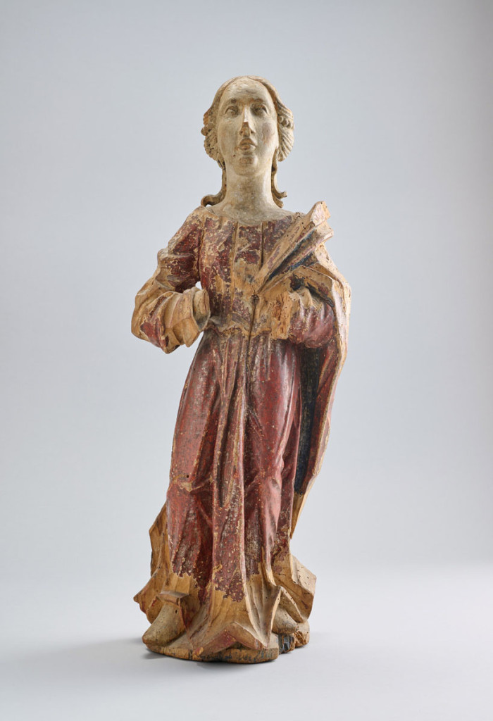Női szent, faragott fa, XVII. század vége, hibás, M: 62 cm