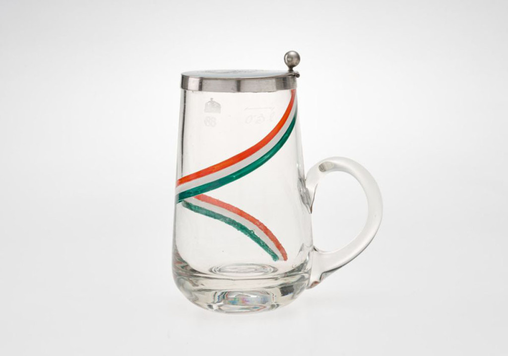Fúvott, színtelen üveg, ezüstmontírozással. Oldalán a nemzeti trikolór színeivel zománcfestett szalagdísszel. Ezüst peremmel, billenőfedéllel és golyó formájú ujjtámasszal. Fedélen vésett tulajdonosi monogrammal. Jelzett: Pest, XIX. század vége, Klein Mózes. M.: 13,5 cm