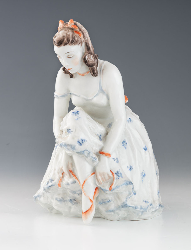Színesen festett porcelán. Cipőjét kötő balerina alakja. Lore Friedrich-Gronau modellje, 1947. Alján jelzett: masszába nyomott 1770 formaszám és LFG művészjelzéssel, valamint máz alatt zölddel bélyegzett márkajegy, alatta Dekor 7011 handgemalt. Rosenthal porcelágyár, Selb, 1950 körül. M.: 26,5 cm