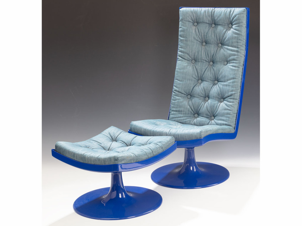 Kárpitozott üvegszálas kompzit műanyag, 1970 körül, Ghyczy Péter (?), kissé kopott huzat, M: 110 cm (fotel) és 40 cm (lábtartó)