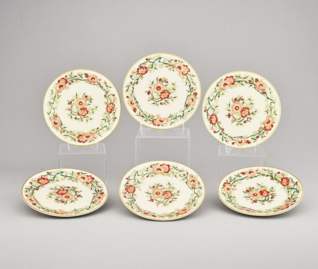festett porcelán bambusz mintával, Zsolnay, egyik tányér repedt, átm. 17,5 cm