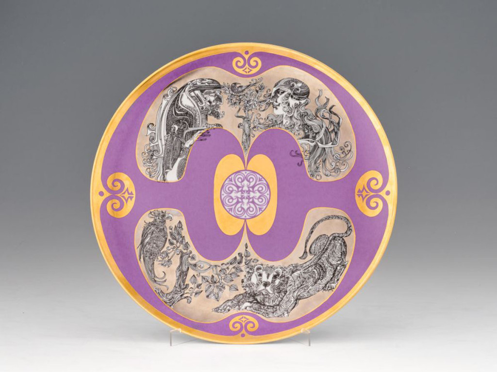 Porcelán, szitanyomat. Aranyozott keretben lila fondon arany és ezüst háttéren fekete kontúros férfi és nőalak, oroszlánnal és madarakkal. Hátoldalán bélyegzett gyári jelzéssel és a művész feliratával, valamint a Képcsarnok Vállalat papírcímkéjével. Színkompozíciónként 20 példányban, számozva, szignálva készült darab – 10 színváltozatban, összesen 200 példány, limitált kiadásban. Szász Endre alkotása. 1/20 példány. Hollóháza, Szász Stúdió. Átm.: 31 cm