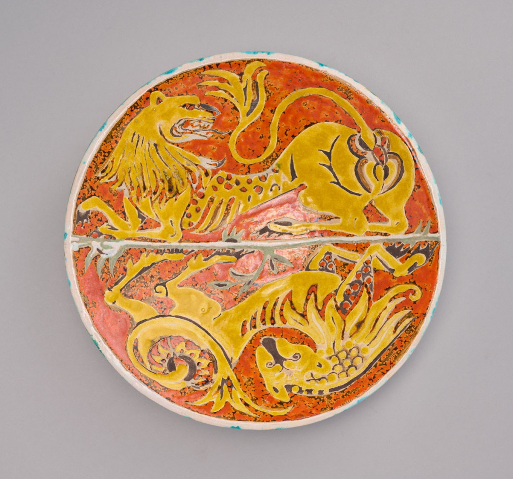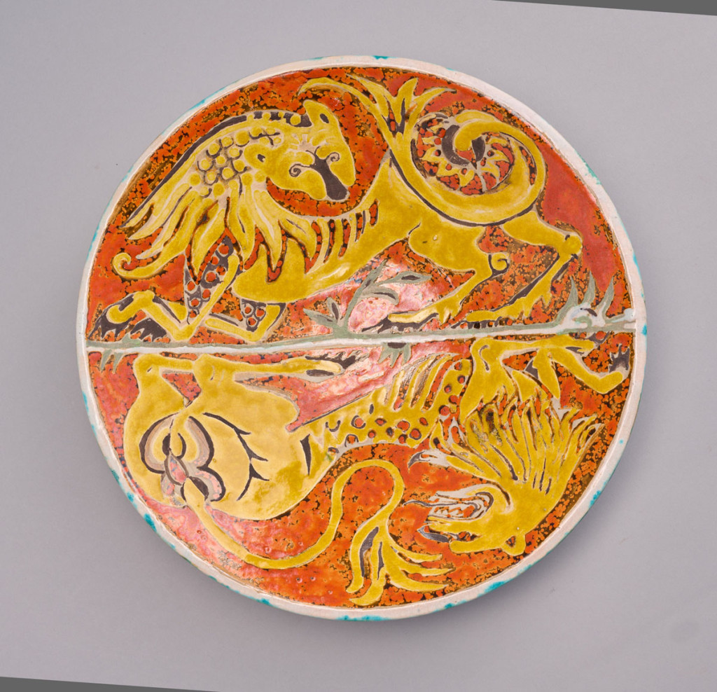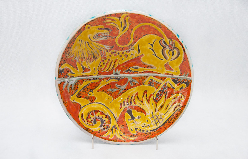 Színesen festett kerámia, kopott, sérült, átm. 32 cm