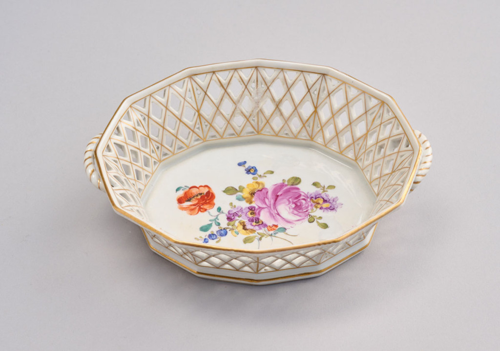 XX. század első fele, áttört szélű porcelán, belsejében festett virágcsokorral, átm: 18 cm
