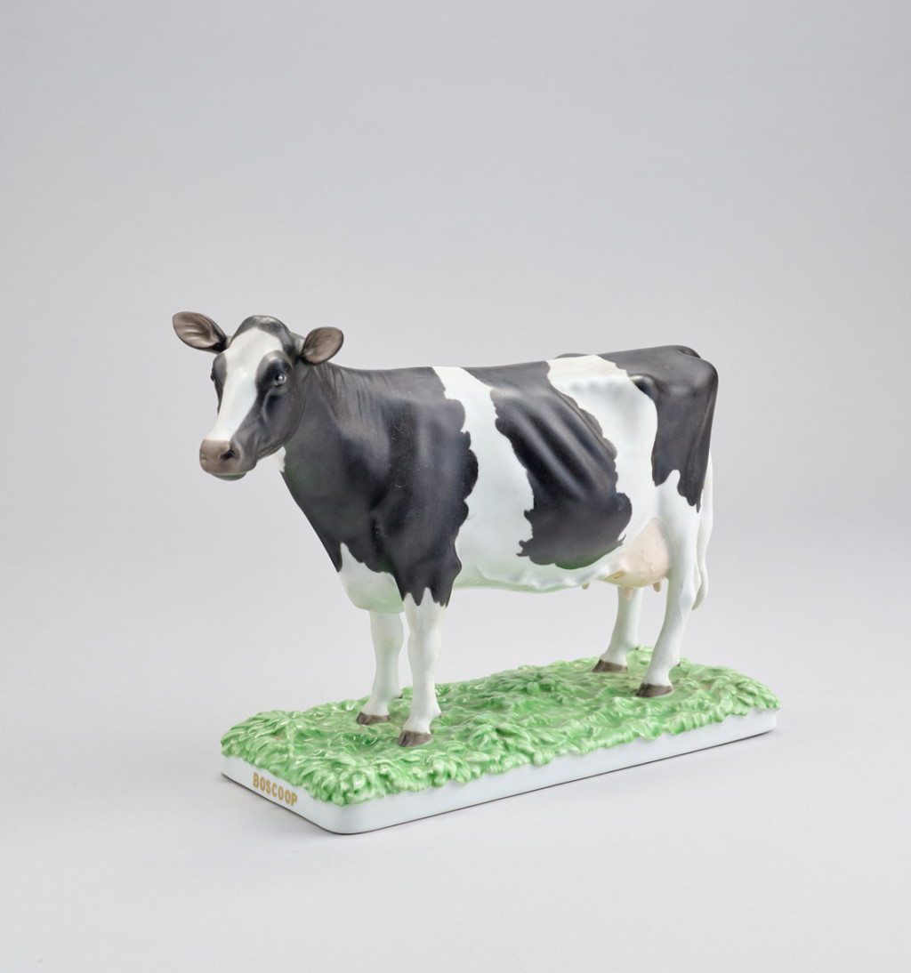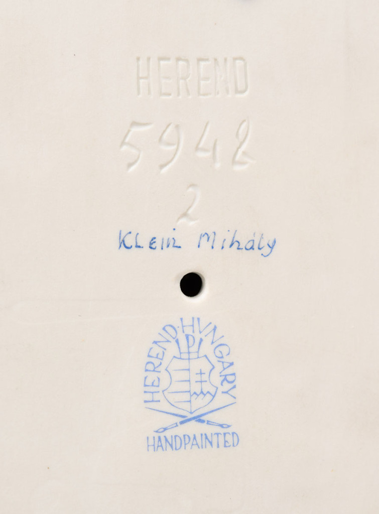 Tehén, festett biscuit porcelán, Herend, alján jelzett: Klein Mihály festőjelzés, formaszám: 5942, XX. század második fele, M: 21 cm