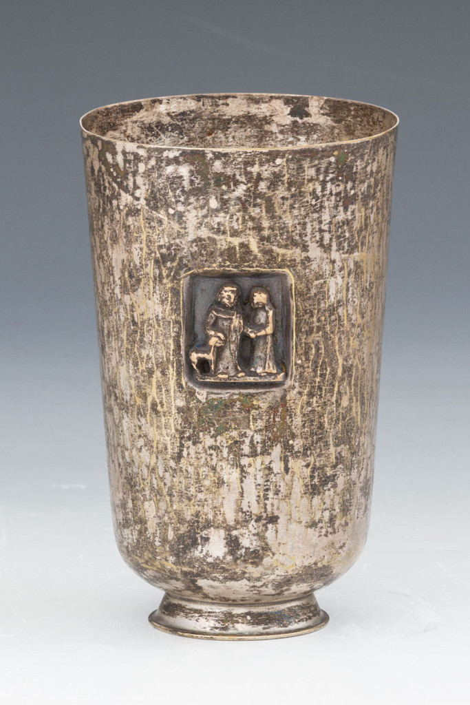 Ezüstözött, díszkalapált fém, oldalain reliefes jelenetekkel. 1970 körül. Alján beütött Tevan jelzéssel. M.: 16 cm