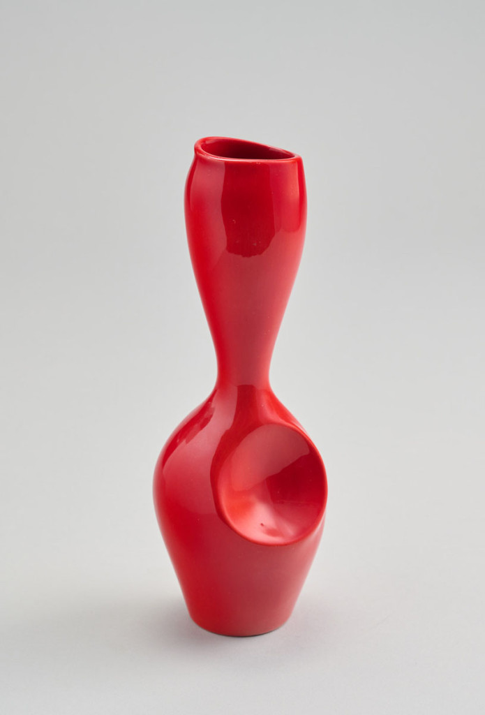 Török János: Díszváza, ökörvérmáz, fajansz, kopott, XX. század második fele, M: 21 cm