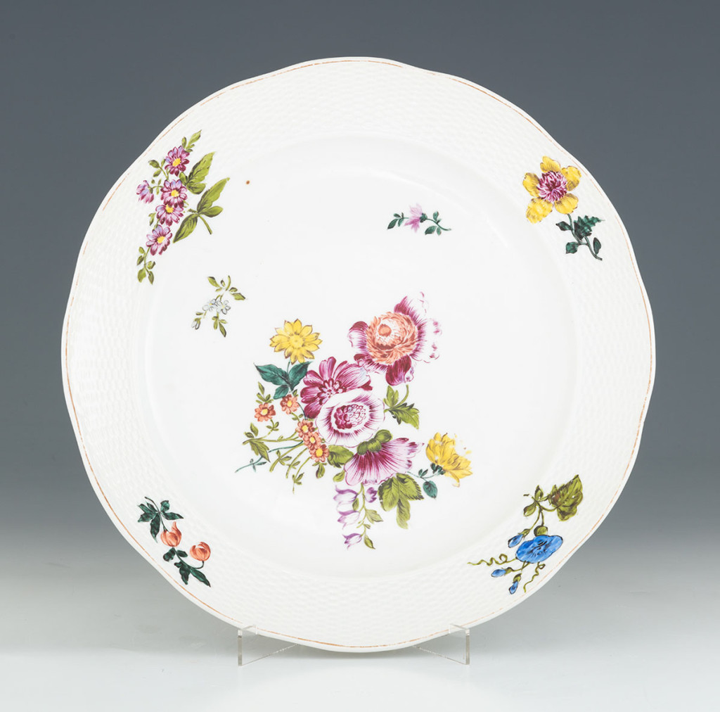 Festett, aranyozott porcelán. Peremén és öblében színes virágcsokrokkal. Aranyozása kopott. Jelzett: máz feletti kék gyári bélyegző. Ungvár, XIX. század vége. Átm.: 26 cm