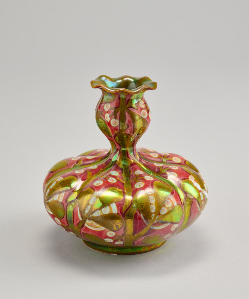 Váza, festett fajansz, Zsolnay, Pécs, 1900 körül, alján jelzett mélynyomással Zsolnay Pécs, formaszám: 5117 (?), M: 10 cm