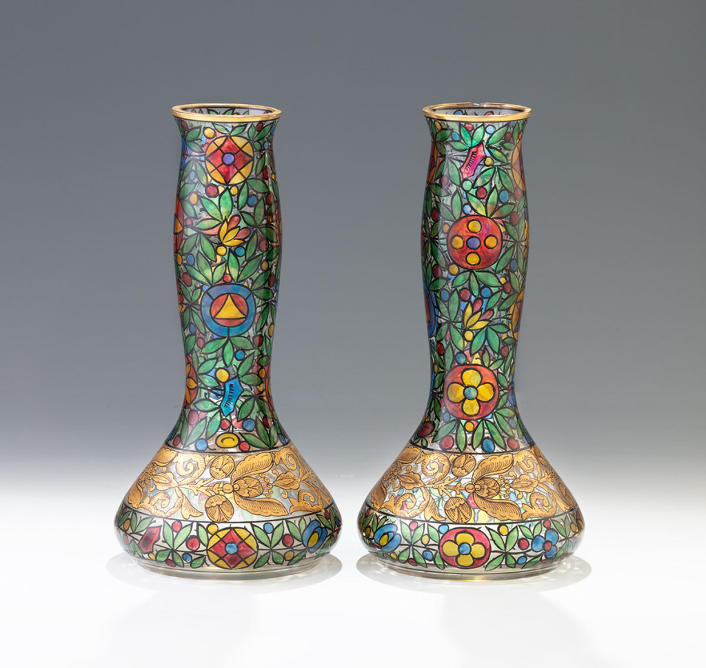 Fúvott, színtelen üveg, színes- és arany zománc festéssel. Egyik váza peremén csorba. Haida, Julius Mühlhaus & Co., 1915 körül. M.: 27 cm