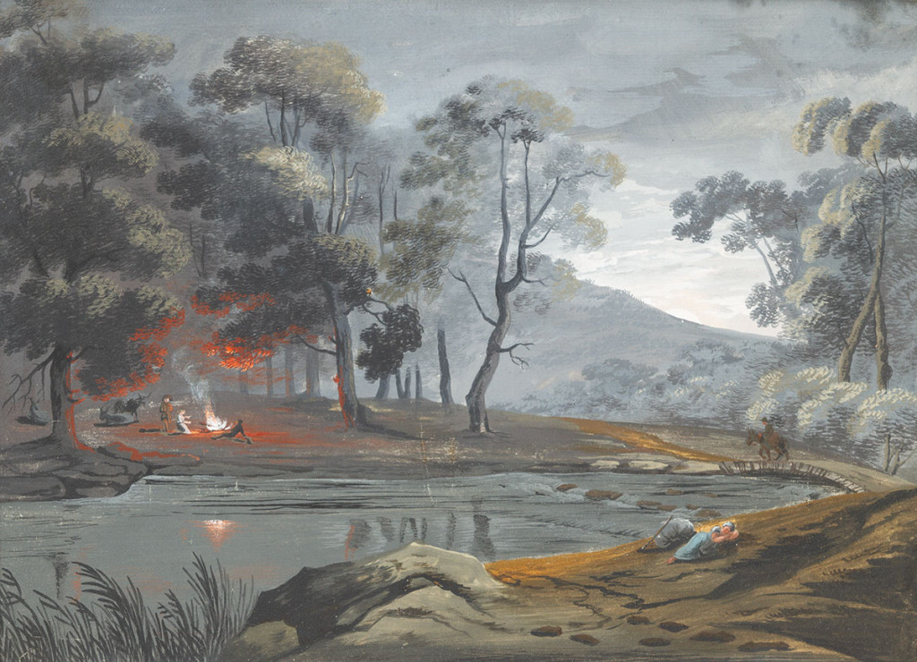 XIX. századi német festő: Romantikus tájkép - Táborozók a tűznél